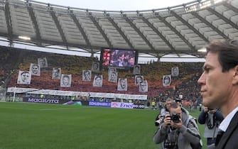 La coreografia della tifoseria romanista vista dalla panchina di Rudi Garcia, tecnico giallorosso -