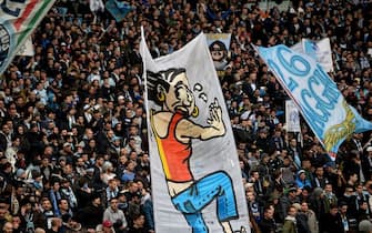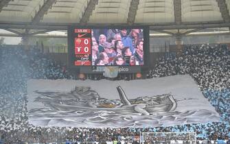La risposta della Curva Nord laziale: un grande striscione su un letto di bandiere bianche e celesti -
