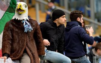Un curioso tifoso della Lazio con una maschera da aquila, simbolo della squadra biancoceleste -