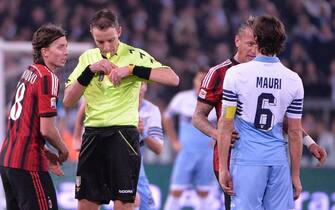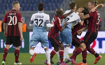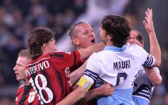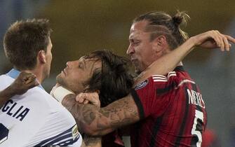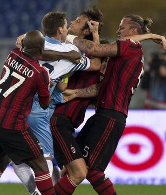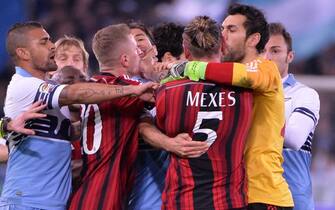 LA FOTOGALLERY. Con il Milan sotto 3-1 Mexes reagisce a un calcetto di Mauri. Scoppia un parapiglia con il francese che mette le mani al collo del capitano della Lazio. Inevitabile l'espulsione, poi le scuse: "Un cattivo esempio"