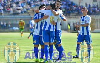 L'abbraccio dei giocatori dell'Akragas al termine dell'ultima partita giocata in casa, sempre contro il Marcianise -