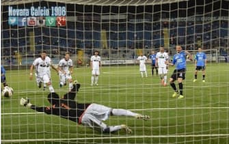 Al 50' il pari dei piemontesi con Evacuo che strasforma un rigore concesso dall'arbitro per un fallo di Bocchetti su Adorjan. Al 13', Gabionetta, su assist di Tuia, colpisce di sinistro per il nuovo vantaggio ospite (foto da novaracalcio.com) -