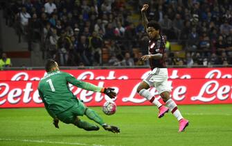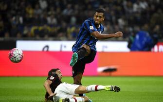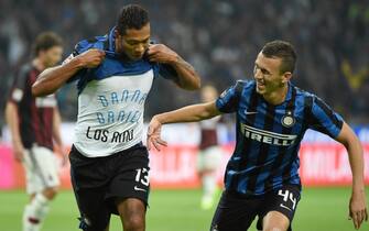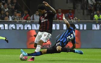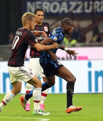 Nel primo tempo, l'attaccante del Milan Luiz Adriano ingaggia un duello personale con la difesa nerazzurra. Prima però lo ferma Handanovic -
