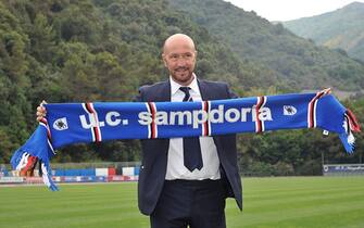 Zenga con la sciarpa della Samp nel giorno della presentazione al centro sportivo di Bogliasco. L'Uomo Ragno, così era soprannominato quando giocava, ha sostituito Sinisa Mihajlovic una volta che il tecnico serbo è andato al Milan -