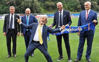 Zenga con lo stato maggiore della Samp nel giorno della presentazione. Anche in quell'occasione ci fu lo show del presidente blucerchiato Massimo Ferrero -