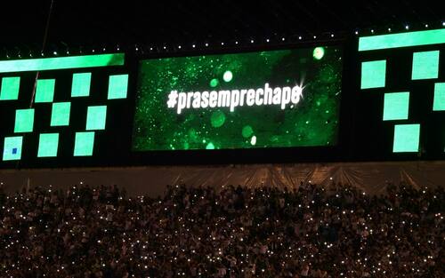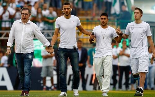 E' il momento più toccante dell'andata della Recopa sudamericana. I quattro sopravvissuti alla tragedia aerea costata la vita a 71 persone, tra cui molti giocatori e l'intera delegazione della società brasiliana, si trovano a parlare davanti a uno stadio pieno -