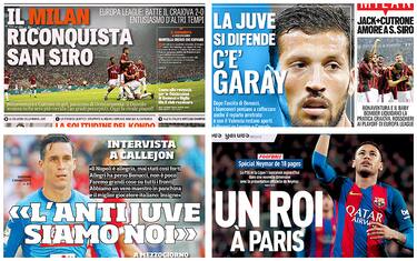 Aperture molto diverse per i principali giornali sportivi italiani: la Gazzetta dello Sport punta sulla vittoria del Milan, il Corriere dello Sport apre con un'intervista a Callejon, Tuttosport con il mercato Juve ("C'è Garay"). All'estero: L'Equipe celebra l'arrivo di Neymar ("Un Roi à Paris") mentre in Spagna si piange la scomparsa di Angel Nieto