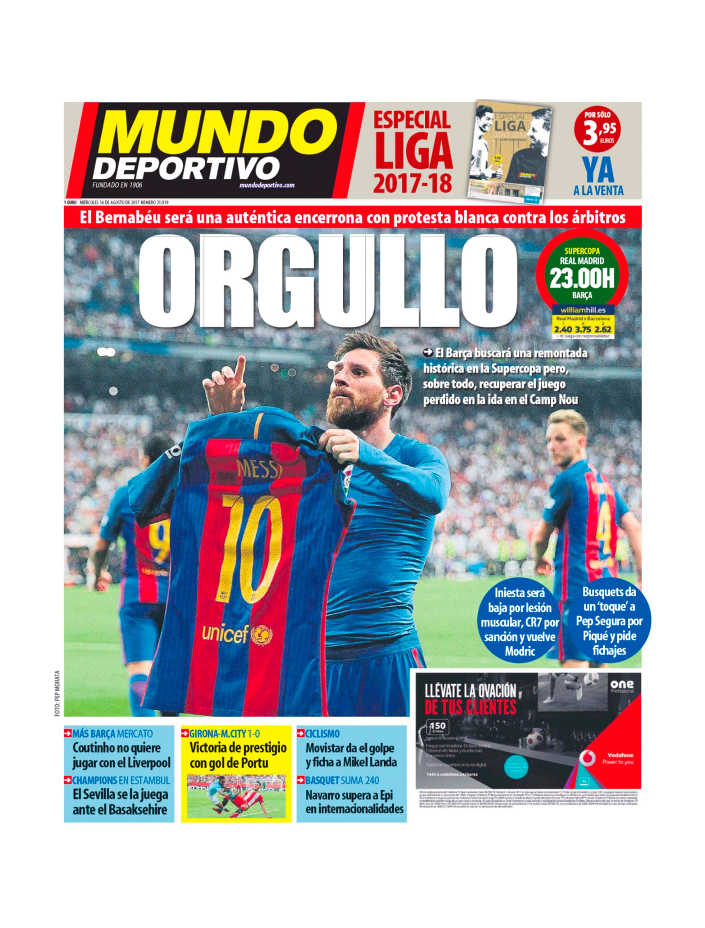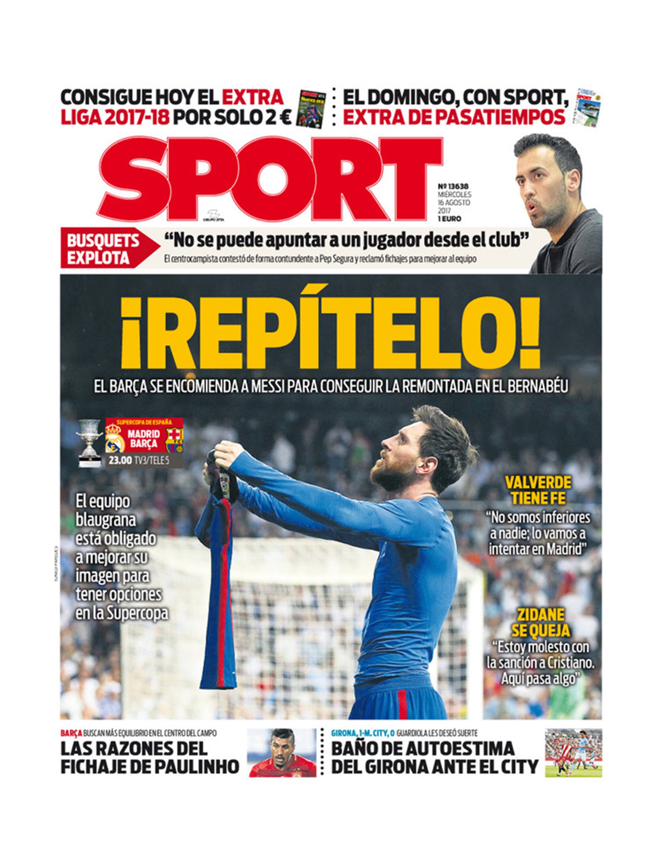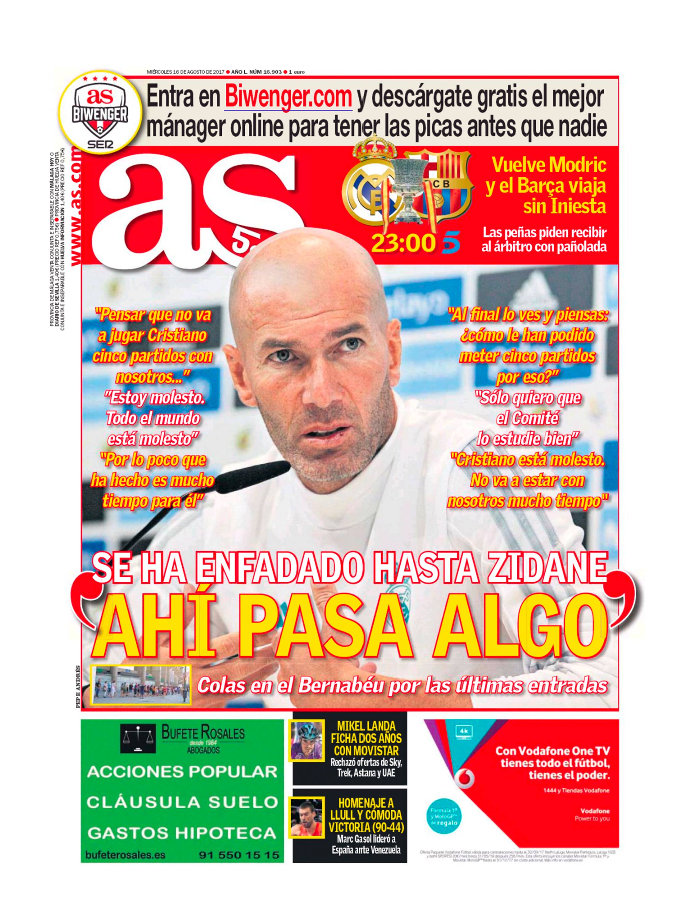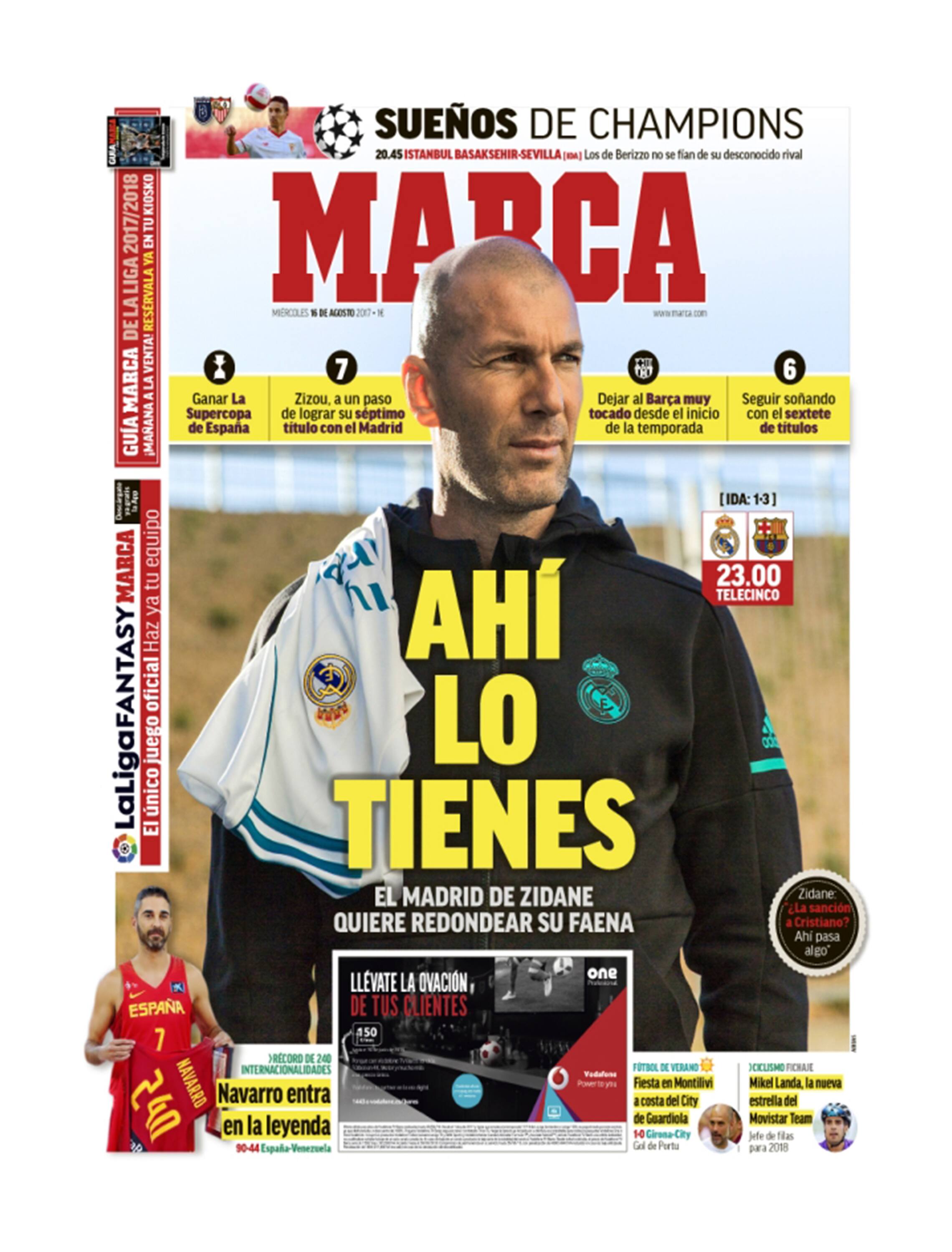 Sui giornali spagnoli il tema di riferimento non può che essere il ‘Clasico’ di Supercoppa, in programma questa sera al Bernabeu dopo l’andata del Camp Nou vinta dal Real Madrid per 3-1. As lancia in prima pagina le parole di Zinedine Zidane, arrabbiamo per la squalifica inflitta a Cristiano Ronaldo che lo obbligherà a rimanere fuori per 5 turni (1 di Supercoppa e 4 di Liga). Il volto dell'allenatore dei blancos compare in primo piano anche su Marca, in questo caso con un sorriso sornione e la volontà di completare il proprio ‘lavoretto’. Il Mundo Deportivo e Sport, invece, regalano la prima a Leo Messi a cui si chiede di tirare fuori l’orgoglio blaugrana.