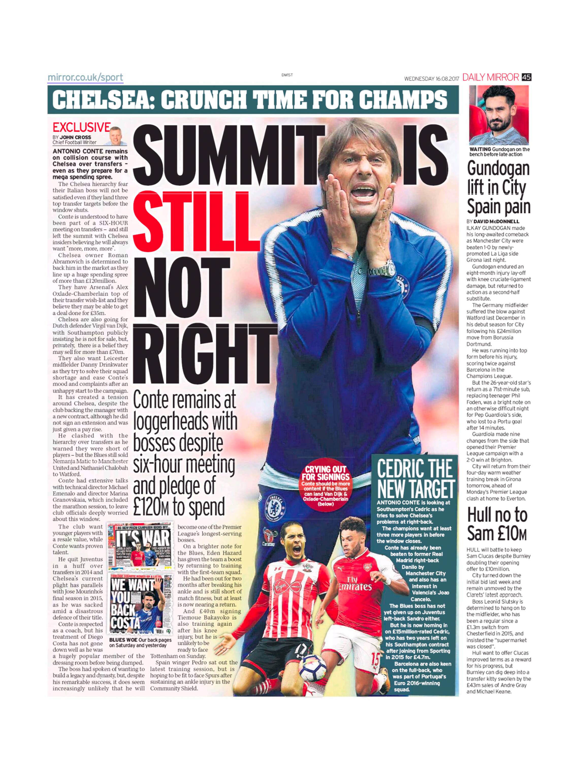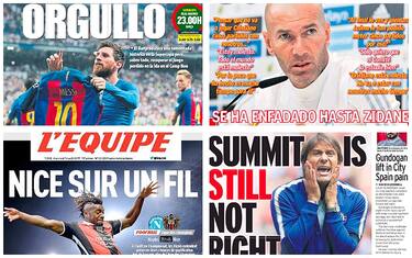 Spazio alle sfide tra Napoli-Nizza e Real Madrid-Barcellona sui principali quotidiani sportivi spagnoli e francesi, in Inghilterra invece spazio al summit in casa Chelsea tra Conte e i vertici del club