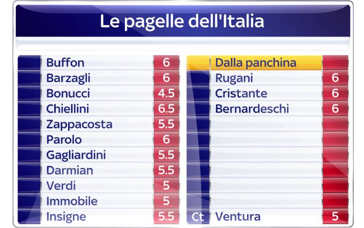 Italia (3-4-3): Buffon; Barzagli (46' Rugani), Bonucci, Chiellini; Darmian, Gagliardini (75' Cristante), Parolo, Zappacosta; Verdi (64' Bernardeschi), Immobile, Insigne. Ct: Ventura