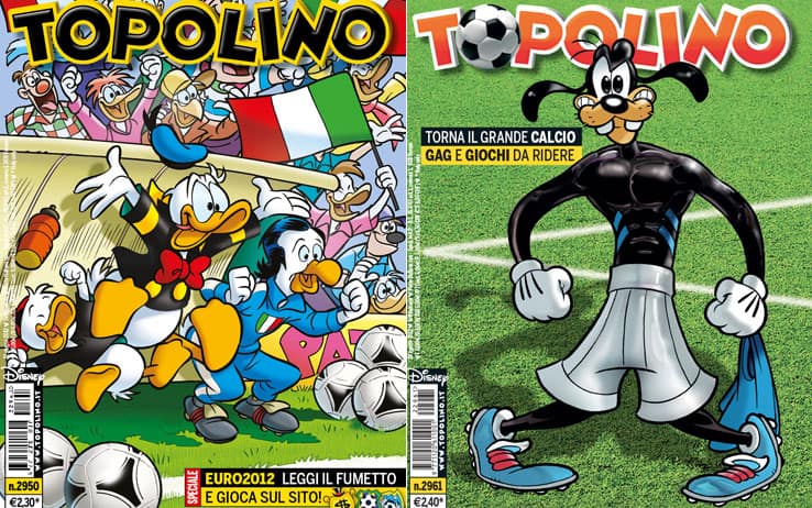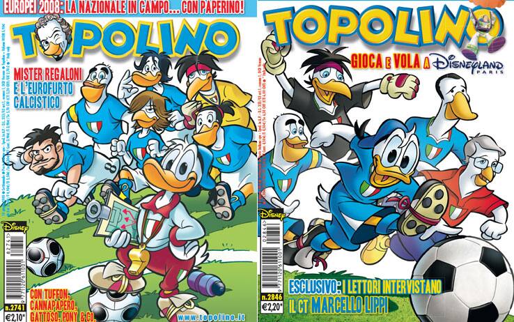 Ma proprio perché Topolino arriva a tutti (chi non l'ha mai letto, anche solo una volta?), non poteva mancare il supporto alla Nazionale prima dei grandi eventi come Mondiali o Europei, attraverso la paperizzazione degli eroi azzurri: tra gli allenatori Lippi e Prandelli, e poi Tuffon, Cannapapero, Gattoso e Luca Pony. Tra le immagini scolpite nella memoria di tutti i tifosi, poi, ci sono i muscoli esibiti da Balotelli a Euro2012 dopo il gol alla Germania. Ancora una volta una foto che unisce, che appartiene alla memoria collettiva: ecco perché Topolino può permettersi di riprenderla.