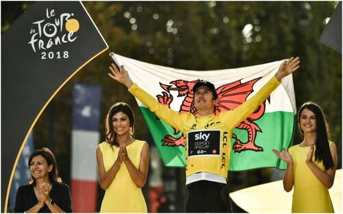 29 Luglio – Geraint Thomas sfila sugli Champs-Elysées e festeggia la vittoria del Tour de France. Il ciclista britannico anticipa in ordine di arrivo Dumoulin e il compagno del team Sky, Froome, aggiudicandosi il primo Grande Giro della sua carriera –