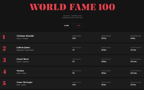 Secondo l'annuale classifica della ESPN è Cristiano Ronaldo lo sportivo più famoso del mondo, davanti a LeBron James e Messi. Dominio del mondo del calcio con 37 calciatori in classifica su 15 diverse discipline (tra cui gli eSport). Appena due i rappresentanti per i motori: Hamilton e Valentino Rossi, primo di due italiani con Buffon. Solo tre le donne