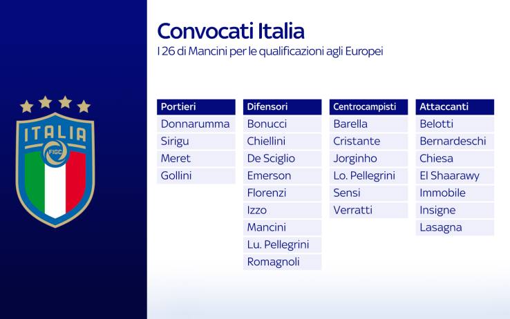 Questa la lista dei 26 azzurri per le partite contro Armenia (5 settembre) e Finlandia (8 settembre):