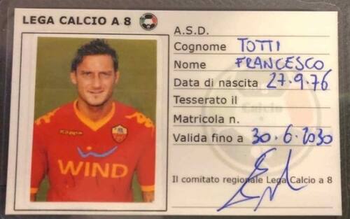 Il tesserino di iscrizione di Francesco Totti alla lega di calcio a 8