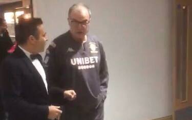 Il tecnico argentino non si smentisce neanche in occasione della cena di gala organizzata dal suo Leeds per festeggiare i 100 anni di storia del club. Niente abito, solo tuta e scarpe da ginnastica ai piedi