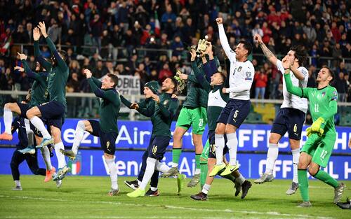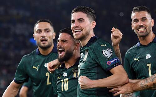 ITALIA-GRECIA 2-0 (12 ottobre 2019). L'aritmetico accesso alla fase finale dell'Europeo va in scena allo stadio Olimpico dove, indossando la nuova maglia verde, la Nazionale si sbarazza dei greci nella ripresa: decidono il rigore di Jorginho (3 gol per lui nell’era Mancini) e il sinistro dalla distanza di Bernardeschi. Sette vittorie su 7 nel girone e qualificazione centrata con tre turni d'anticipo: mai era accaduto nella storia dell’Italia. "Vorrei ringraziare il pubblico che ci ha sempre sostenuto - le parole del Ct -, spero che tornino le 'notti magiche' e che a giugno sia ancora più bello"