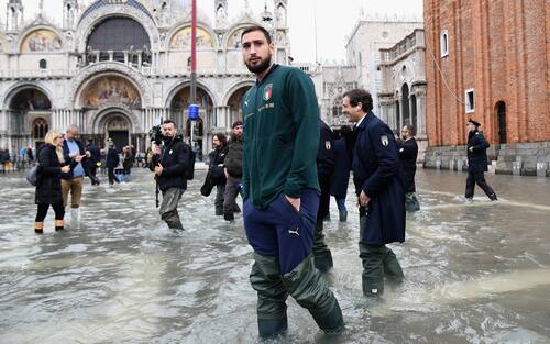 L'ABBRACCIO A VENEZIA. All’indomani della vittoria in Bosnia, prima di raggiungere Palermo per l’ultimo match delle qualificazioni, la Nazionale si reca nel capoluogo veneto mostrando vicinanza alla città e ai suoi abitanti colpiti dall’eccezionale fenomeno dell’acqua alta. Allenamento degli Azzurri e visita della delegazione costituita da Vialli, Donnarumma e Gabriele Gravina che presenzia a piazza San Marco. "Venezia supererà anche questa, come un atleta che subisce un grave infortunio e si rialza", il commento del nuovo capodelegazione Gianluca Vialli