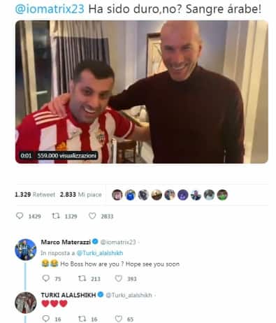 L’allenatore dell’Almeria è Guti, ex compagno di squadra di Zidane al Real Madrid. I due organizzano un incontro tra vecchi amici, al quale assiste entusiasta anche Turki Al-Sheikh. Il presidente dell’Almeria ha così il piacere di incontrare di persona uno dei calciatori più forti di sempre, al quale chiede di autografare la maglia dell’Almeria. Ma Turki Al-Sheikh si spinge oltre: simula addirittura la celebre testata di Zidane “colpendo” lo stesso francese sul petto. Naturalmente si tratta di un episodio simpatico, un siparietto al quale il francese si presta con il sorriso sulle labbra. Dopo aver registrato il video, il presidente dell’Almeria lo posta su Twitter, tagga Materazzi e gli chiede: “Ho colpito abbastanza forte? Sangue arabo!”. L’ex difensore dell’Inter risponde: “Ciao presidente, come stai? Spero di vederti presto”.