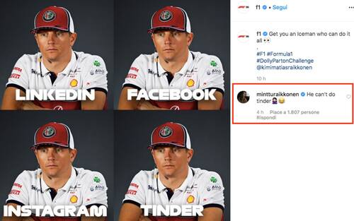 Ancora più divertente il siparietto per Kimi Raikkonen e la foto postata dal profilo ufficiale della Formula1. Il commento della moglie: "Non può fare Tinder"