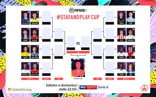 “Stiamo a casa, Giochiamo insieme”: l’iniziativa, promossa da EA Sports per invitare la community dei videogiocatori a rispettare le misure restrittive introdotte per limitare la diffusione del coronavirus, trova adesso dei testimonial d’eccezione. Venti calciatori, da tutte le squadre d’Europa, si sfideranno infatti nella "Stay and Play Cup", un torneo di Fifa20 con le partite in onda su Sky Sport Uno nel weekend. Appuntamento sabato alle 22 con ottavi e quarti, domenica alle 22 con semifinali e finale. Il tabellone con gli incroci c’è già, resta da scoprire chi vincerà. Intanto ecco tutti i protagonisti