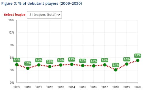 MAI COSÌ TANTI ESORDIENTI - A livello europeo, la percentuale di giocatori che hanno esordito in un campionato professionistico non è mai stata così elevata come nel 2020: 5,4% contro una media del 4,1% tra il 2009 e il 2019