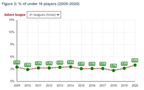 SPAZIO AGLI U-19 - In seguito alla pandemia da Covid-19, uno dei principali cambiamenti osservati nel 2020 è l'aumento della percentuale di giocatori molto giovani nelle squadre in Europa. Se tra il 2009 e il 2019 gli U-19 erano in media il 3,2% del numero totale di giocatori, al 20 ottobre 2020 la percentuale ha toccato un picco mai registrato in precedenza: il 4%