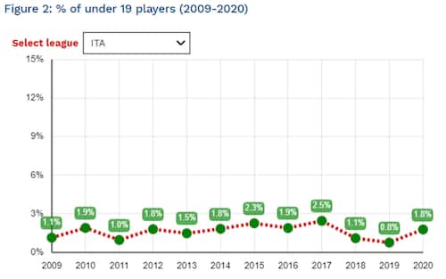 IN SERIE A - Nel caso del campionato italiano, l'impiego dei giocatori U-19 è sensibilmente aumentato rispetto al 2019: da 0,8% a 1,8%, percentuale in crescita sebbene inferiore ai dati registrati tra il 2015 e il 2017. Un dato che s’inserisce in un contesto nel quale c’è poco riposo tra le partite e che, con 5 sostituzioni possibili, ha permesso agli allenatori di dare maggiore spazio ai giovani