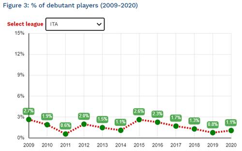 DEBUTTANTI IN A - Tornando al campionato italiano, la percentuale degli esordienti sul totale dei giocatori risponde all’1,1%: un dato superiore al 2019 ma inferiore ai quattro anni precedenti