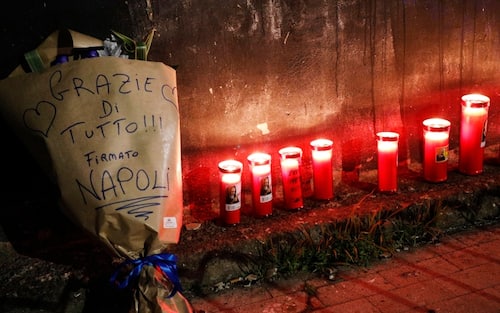 Candele davanti al murales di Maradona ai Quartieri Spagnoli, nel cuore di Napoli, per omaggiare Diego