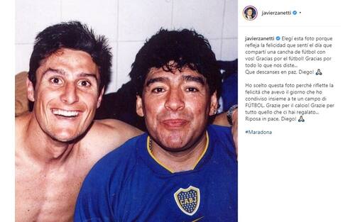 Javier Zanetti: "Ho scelto questa foto perché riflette la felicitá che avevo il giorno che ho condiviso insieme a te un campo di FÚTBOL. Grazie per il calcio! Grazie per tutto quello che ci hai regalato... Riposa in pace, Diego!".