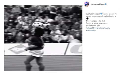 Esteban Cambiasso e il mitico video del "riscaldamento" di Maradona sulle note di "Life is life" a Monaco di Baviera, prima della semifinale di Coppa Uefa tra Napoli e Bayern: "Grazie Diego! Ti ricorderò così... ballando con il pallone. Ci hai dato la felicità! Le tue giocate saranno eterne...".
