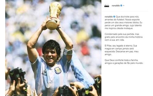 Ronaldo (il Fenomeno): "Che giornata triste per noi amanti del calcio. Il nostro sport perde uno dei suoi più grandi idoli. Perdo un grande amico, il cui talento mi ha ispirato sin da quando ero bambino. Sgomento per la sua dipartita, ma grato per l'incontro della mia storia con la sua, nella vita. Pibe, la tua eredità è eterna. La tua magia sul campo non sarà mai dimenticata. Riposa in pace amico mio. Possa Dio confortare l'intera famiglia, gli amici e le generazioni di fan in tutto il mondo".