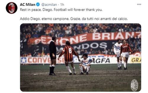 Il Milan: "Addio Diego, eterno campione. Grazie, da tutti noi amanti del calcio".