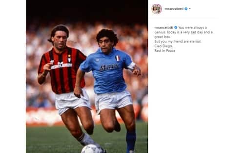 Carlo Ancelotti: "Sei sempre stato un genio. Oggi è un giorno molto triste e una grande perdita. Ma tu amico mio sei eterno. Ciao Diego. Riposa in pace".
