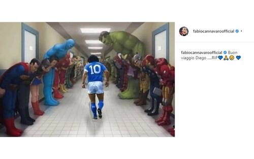 Fabio Cannavaro condivide la foto di Maradona, salutato con un inchino da tutti i supereroi... E poi, semplicemente: "Buon viaggio Diego".