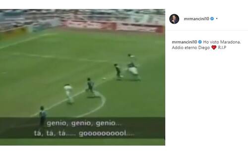 Il Ct azzurro Roberto Mancini ha condiviso il video del gol del secolo, realizzato da Maradona a Messico '86 contro l'Inghilterra: "Ho visto Maradona... Eterno Diego".