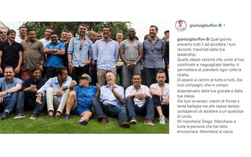 Gigi Buffon: "Quel giorno eravamo tutti lì ad ascoltare i tuoi racconti, trascinati dalla tua leadership. Quello stesso carisma che ti permetteva di prenderti ogni volta la ribalta. Di essere al centro di tutto e tutti. Dei tuoi compagni, che in campo dipendevano dalle tue giocate e dalla tua classe. Dei tuoi avversari, inermi di fronte a tanta bellezza ma allo stesso tempo consapevoli di assistere a un qualcosa di unico. Mi mancherai Diego. Mancherai a tutte le persone che hai fatto emozionare. Mancherai al calcio".