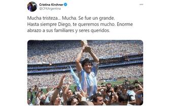 Cristina Kirchner, ex presidente e attuale vice della Repubblica argentina: "Molta tristezza... Molta. Se ne va un grande. Addio Diego, ti vogliamo molto bene. Un abbraccio enorme ai tuoi parenti e ai tuoi cari".