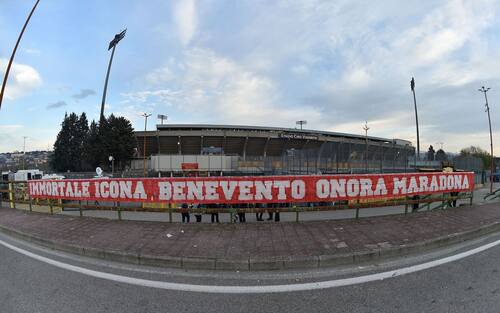 Serie A, BENEVENTO-JUVENTUS - Lo striscione fuori dal Vigorito nel ricordo di Diego: "Immortale icona, Benevento onora Maradona"