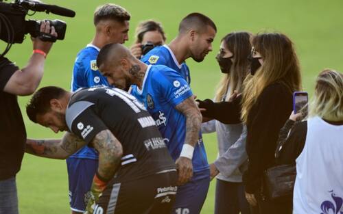 Prima del match contro l'Huracan, i giocatori del Gimnasia hanno ricevuto in campo le due figlie di Maradona Dalma e Giannina per porgere le condoglianze