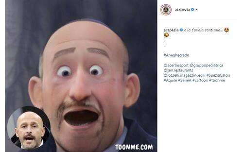 ITALIANO - Lo Spezia ha utilizzato la app "ToonMe" per trasformare alcuni dei protagonisti della squadra ligure in cartoni, appunto, condividendola sui social: esilarante la caricatura dell'allenatore Vincenzo Italiano, artefice della "favola" del neopromosso club ligure.