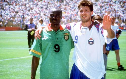 OLEG SALENKO, voto 10 in Russia-Camerun 6-1 (1994) - Usa 1994. Nessuno ha mai segnato cinque gol in una sola partita dei Mondiali, ci riuscì l'ex anche di Valencia e Rangers negli anni Novanta. Accadde nella terza partita del girone. Con le due nazionali già eliminate, Salenko (in foto con Roger Milla) riuscì comunque a staccare il suo "biglietto per la storia", come scritto dall'Équipe.