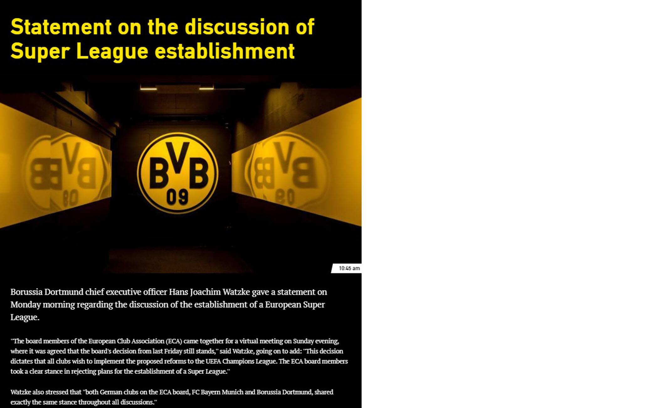 DALLA GERMANIAPolemiche e discussioni per l'annuncio della Superlega dalla Germania, dove è arrivato il no di Borussia Dortmund e Bayern Monaco al nuovo progetto: "Stiamo con la Uefa per la riforma della Champions", le parole del Ceo dei gialloneri Watzke. Contrari anche l'allenatore dei bavaresi Flick ("Non è una buona cosa per il calcio") e la Federazione tedesca, che "si oppone a qualsiasi concetto di Superlega europea". Rummenigge: "Fiducia alla nuova Champions"
