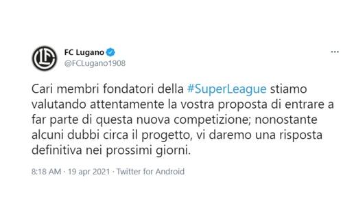 Il Lugano club della SuperLeague svizzera, nella sua storia, si è affacciato in qualche circostanza alle competizioni europee, e il club ha voluto così ironizzare sulla SuperLega attraverso la propria pagina Twitter