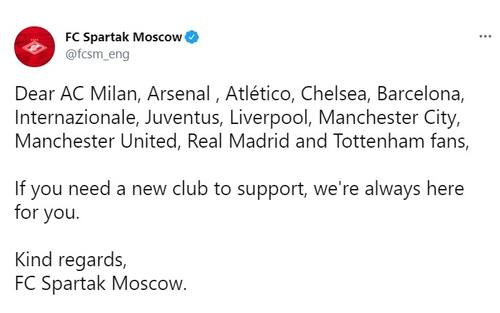 Anche lo Spartak Mosca attraverso la pagina in inglese di Twitter si rivolge ai club fondatori della SuperLega: "Se avete bisogno di un club da sostenere, siamo sempre qui per voi"