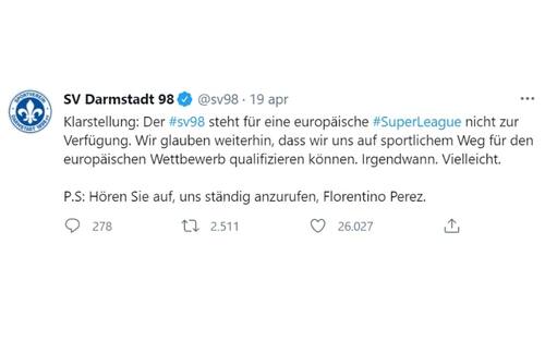Anche il Darmstadt, società che milita nella Zweite Liga (seconda divisione tedesca), ironizza sulla Superliga con un post su Twitter: "La SV Darmstadt 98 non è disponibile per una Superlega europea. Crediamo ancora di poterci qualificare a una competizione europea in modo sportivo. A volte può succedere. P.S. Florentino Perez smettila di chiamarci a tutte le ore", rivolgendosi in modo simpatico al presidente della Superlega. Nessuna squadra tedesca ha aderito alla Superlega