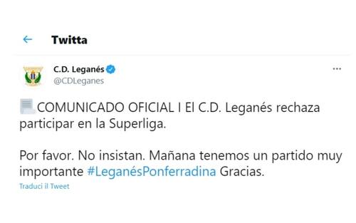 Molto simpatico il Tweet del Leganes che milita nella Segunda spagnola, che 'rinuncia' alla partecipazione alla SuperLega: 'Per favore non insistete perché abbiamo una partita molto importante contro il Ponferrandina"