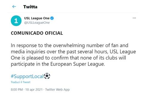 L'ironia sulla SuperLega arriva anche da oltreoceano con la presa di posizione della USL League One, ovvero la terza lega del Nord America: "In risposta alle moltissime richieste arrivate nelle ultime ore, la USL League One conferma che nessuno dei suoi club prenderà parte alla SuperLega
