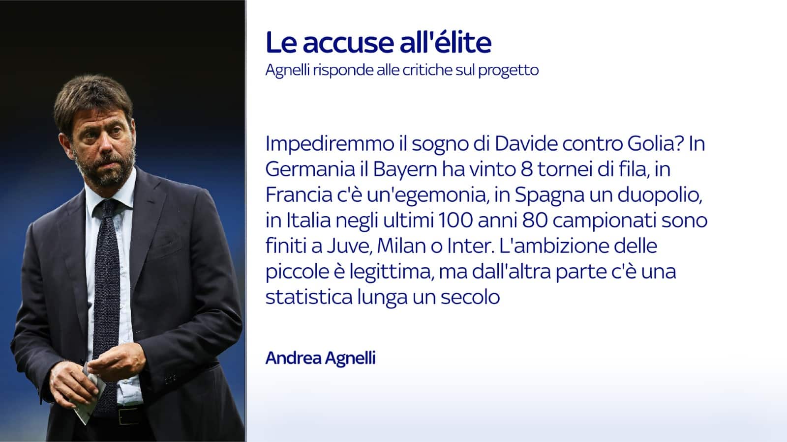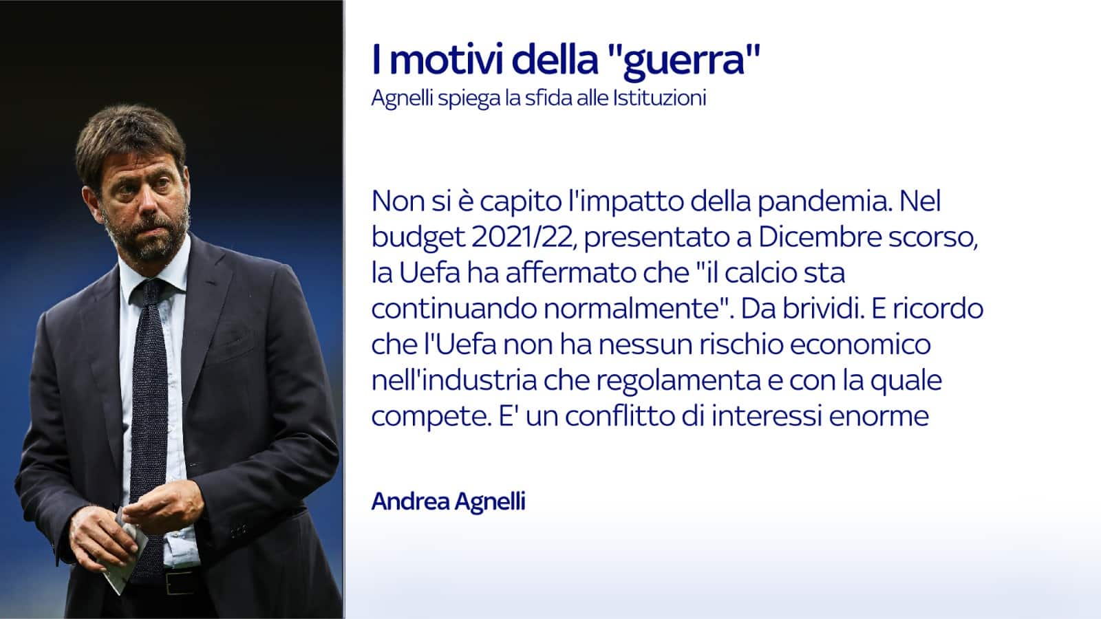 Oltre che dal quotidiano Repubblica, Agnelli è stato intervistato anche da Ivan Zazzaroni sul Corriere dello Sport: "Ci sono cinque punti che voglio chiarire. Uno: nessuna minaccia ai campionati domestici. Anzi, la ferma volontà da parte del gruppo delle dodici società di continuare a partecipare alle competizioni nazionali, sia al campionato, sia alle coppe. Quindi totale adesione a quella che è la tradizione. Due: fin dalla costituzione della SLCo, la Superlega, si è incoraggiato il dialogo con le istituzioni, nel nostro caso Fifa e Uefa. Tre: quello che stiamo facendo è perfettamente legale, stiamo esercitando una libertà prevista dal trattato dell’Unione europea, e questo aspetto lo considero particolarmente importante. Quattro: il calcio sta vivendo una crisi enorme di appeal che investe le nuove generazioni. Hanno inciso gli stadi chiusi da un anno. Per chi ha figli di dieci, quindici, vent’anni la disaffezione è più che palpabile: i giovani si interessano ad altre cose. Evidentemente – e qui entriamo in una sfera macroeconomica – questo triste fenomeno ha subìto un’accelerazione a causa della pandemia. Quinto, è forse il punto-chiave, quella che stiamo cercando di organizzare è la competizione più bella al mondo".